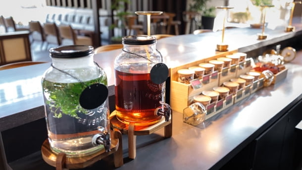 ロビーラウンジでは、自家製のデトックスウォーターをはじめ、コーヒー、紅茶、緑茶、ハーブティーなど全10種類以上のお飲み物をフリーフローでご用意しています。宿泊者へお配りする「オリジナルタンブラー」に入れて、お部屋をはじめサーマルプールなどの温浴施設へもお持ち込みいただけます。