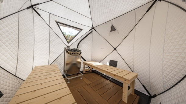 プライベートな空間でお連れ様と一緒に楽しめるサウナ。自然の中で外気浴をしながらリラックスできます。