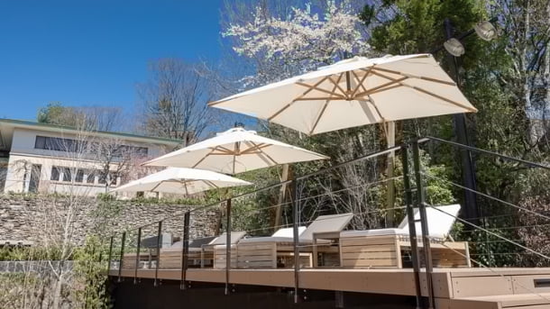 プールからつながるウッドデッキは、雄大な箱根の山々を眺めながら大自然の風を感じることができるスペース。開放感を贅沢に味わう「ととのいテラス」で思い思いにリラックスした時間をお過ごしください。
