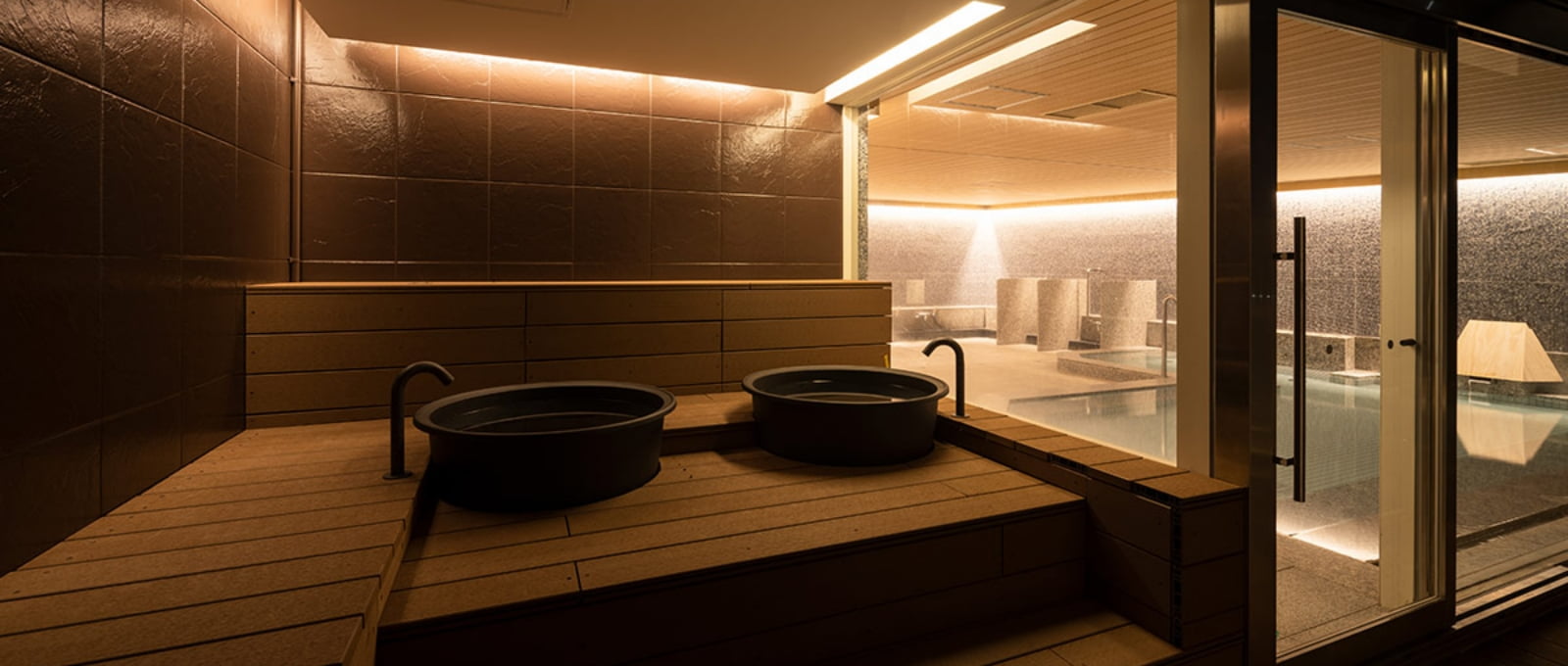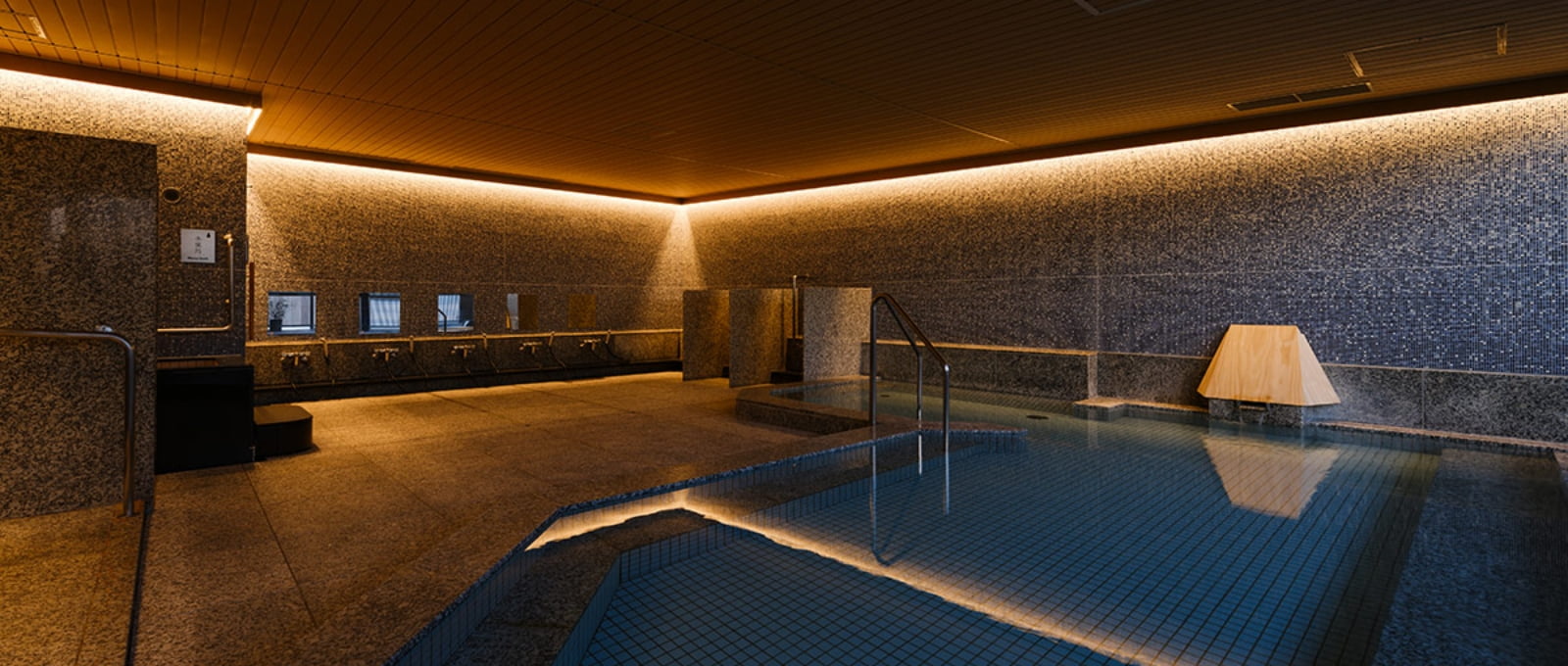沖のヨットや漁船の灯りなど、美しい夜景を眺めながらゆったりとつかれる大きな湯船の温泉大浴場です。