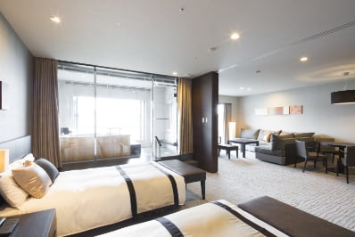 ゆったりとした寝室とリビングのスペースをご用意。空と海を眺める開放的な半露天風呂は、敷地内の源泉を引湯。