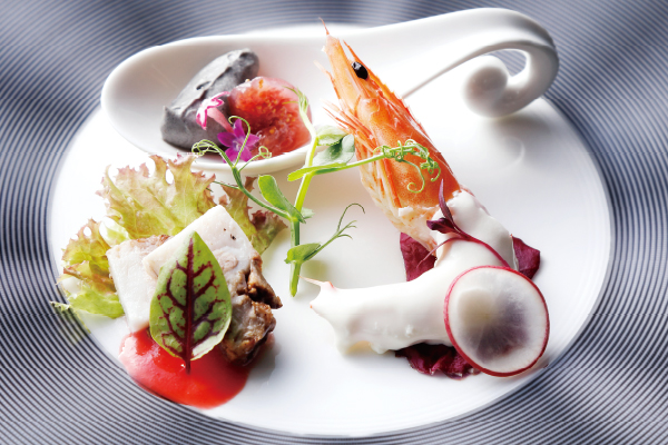 「アミューズ」那須郡司豚のコンフィとフランボワーズのソース、いちじくと黒胡麻のムース、海老のショーフロア